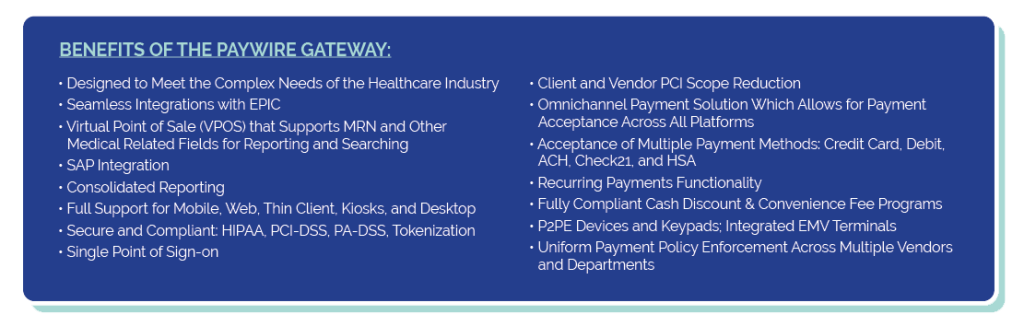 The Paywire Gateway not only delivered a frictionless solution for John’s Hopkins’ complex physical payment needs, but it was also seamlessly integrated into their existing EPIC platform, allowing for additional online payment capabilities with full MyChart support. For the first time, all departments across their vast healthcare system were able to utilize a singular operating system, with a single point of sign-on — regardless of their physical location. Thanks to the robust capabilities of the Paywire Gateway, John’s Hopkins saw immediate gains in efficiency across its entire healthcare system and realized the benefits of higher employee and patient satisfaction, lower operating costs and increased revenues.