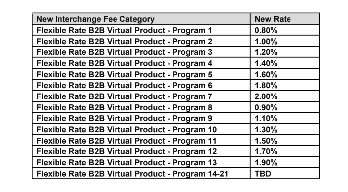 Merchants may see new Flexible Rate B2B Virtual Product interchange categories and rates.