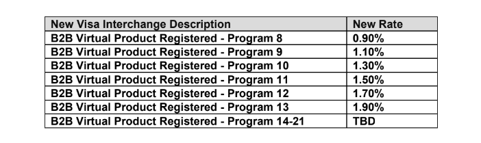 Visa is expanding the B2B Virtual Payments Program by adding new interchange fee descriptions and rates: