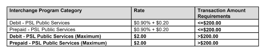 Consumer Exempt Debit and Consumer Exempt Prepaid sales greater than $200 will be eligible for the new PSL-Public Services (Maximum) interchange program.