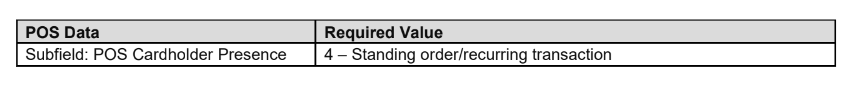 Mastercard is requiring the submission of the recurring payment indicator when submitting a card not present cardholder-initiated transaction that starts a series of recurring payments, as well as on each subsequent recurring payment.